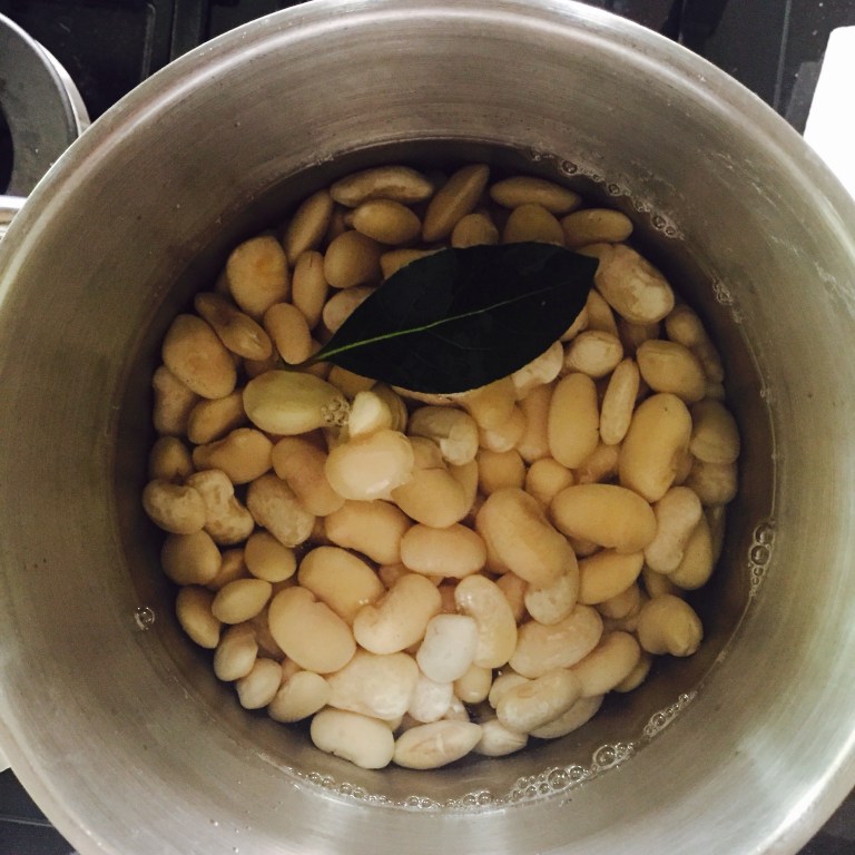 Drain and give the beans another rinse in a colander. Wipe out the pot just to make sure any scum ( I know I know) has been removed. Return the beans, cover with plenty of water and add the bay leaf and 2 whole garlic cloves. Bring to the boil, lower the heat and cook, partly covered, for about 1 1/4 hours, until beans are tender. Skim the surface when necessary. Add salt towards the end.