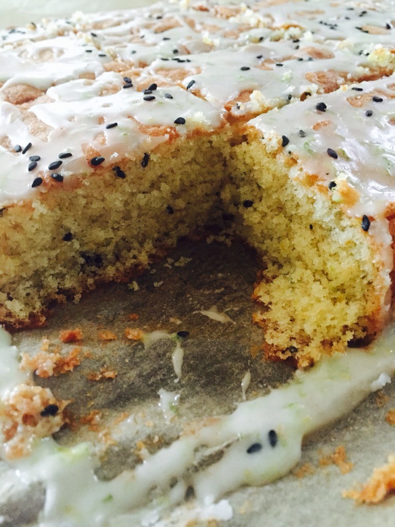To make the icing, mix the sifted icing sugar with the lime juice and the zest to form a runny paste. Spoon this mixture over the traybake then sprinkle on the sesame seeds.