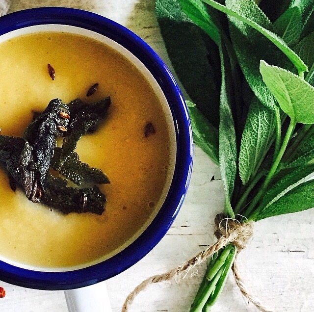 This recipe is a combination of two different recipes that I use and it seems to work really well. I’m not keen on a sweet soup and this seems to have just the right balance of a subtle background spice. Obviously you can add more chilli flakes if you want it hotter. The other thing I would suggest is to taste it before you add the salt & pepper at the end of cooking, and keep tasting until you’re happy. A swirl of cream could be added at the end, although I don’t bother. I’ve garnished with crispy sage and toasted cumin seeds but you really don’t have to. I’ll leave the fancy finish up to you, if you’re feeling really creative crispy bacon pieces would be a nice addition. I don’t need to tell you about how delicious it will be with fresh baked bread!!!!!