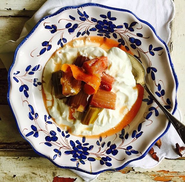 Sprinkle over the sugar along with the stem ginger, add the cinnamon stick, star anise, orange peel, drizzle over the stem ginger syrup. Toss everything together to ensure everything is coated. Cover tightly with tin foil and roast for 10mins. Uncover and cook for a further 5-10 mins until the rhubarb is soft but still holds its shape.