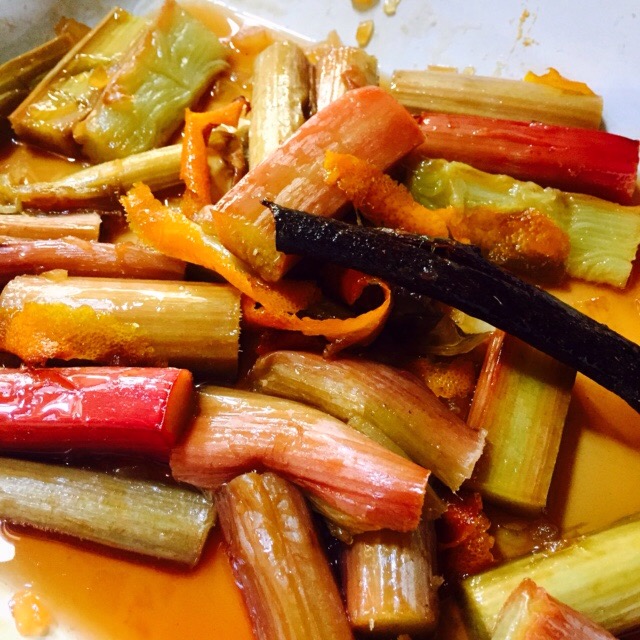 Take the rind off the orange with a vegetable peeler. Cut the rhubarb into 2 1/2 pieces and put them in the roasting tin in a single layer.
