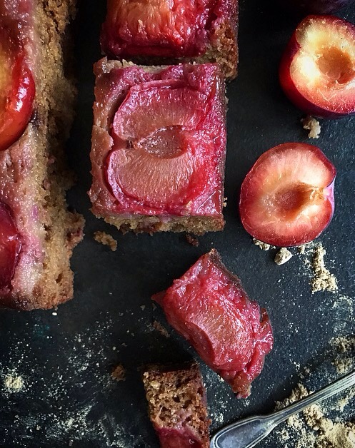 - 500g plums halved and stones removed ( you need enough to cover the bottom of the tin )