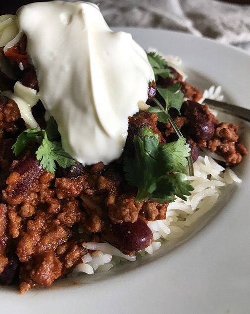 Apparently we’re due for a cold snap so what could be better than a big pot of homemade chilli! This recipe is great for days when time is short, it uses a couple of cheats, well I say cheats they are not really cheats they are a couple of little tips that make your life easier! I make two different chilli recipes this one being slightly easier but still just as delicious. I often at least double batch and freeze, it freezes perfectly so it’s silly not to make extra! Unless you have mince beef in the freezer it’s the only fresh ingredient, everything else is from the larder or freezer! I’ve given spice quantities that should give you just the right amount of heat but obviously adjust as you wish. I have mentioned many times we love hot spices here so I can at times be a bit heavy handed! I’ve cooked this back with the quantities given and I’m confident it won’t blow your socks off!!