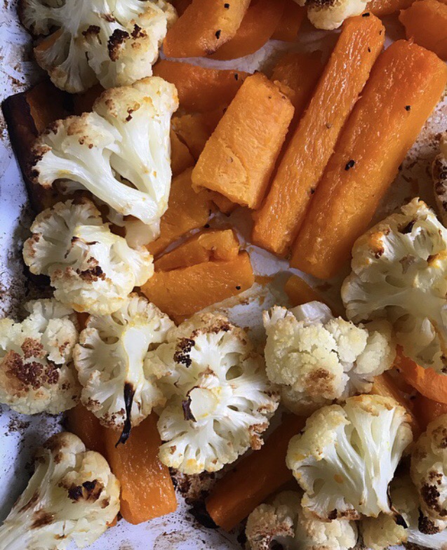 Preheat the oven. In a large roasting tin add the butternut squash with one tablespoon of the veg oil and season to coat,  roast in the oven for 20mins then add the cauliflower florets, stir to mix and roast for another 25-30 mins or until both are tender and a little charred.